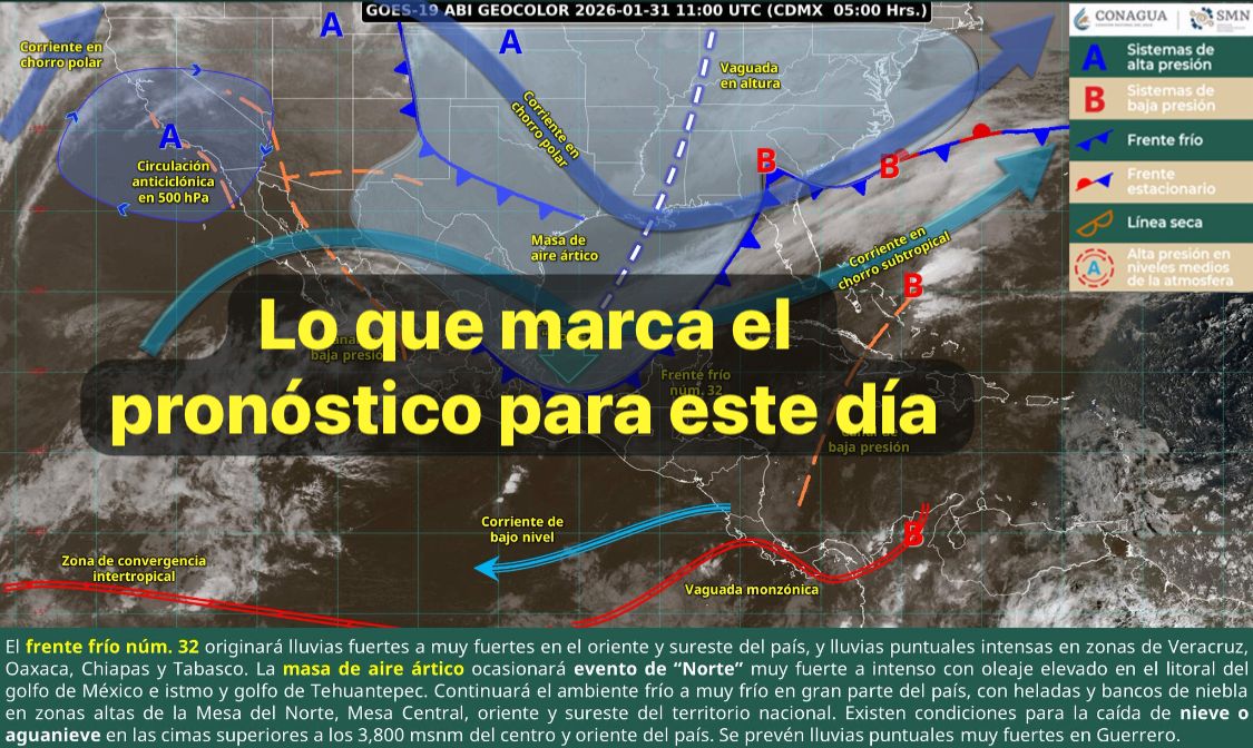 Así mismo, la masa de aire ártico asociada al frente, mantendrá evento de “Norte” muy fuerte a intenso en el litoral del golfo de México, así como en el istmo y golfo de Tehuantepec, con oleaje elevado en sus costas; además, continuará el ambiente frío a muy frío en gran parte del país, con heladas y bancos de niebla en zonas altas de la Mesa del Norte, Mesa Central, oriente y sureste del territorio nacional; también se mantienen condiciones para la caída de nieve o aguanieve en las cimas superiores a los 3,800 msnm del centro y oriente del país (Ajusco, Sierra Negra, Malinche, Popocatépetl, Iztaccíhuatl, Nevado de Toluca, Pico de Orizaba y Cofre de Perote).
