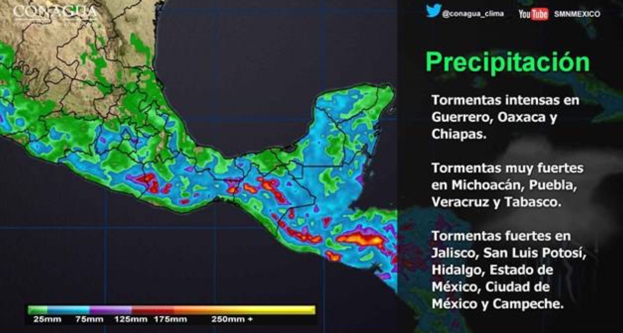 Ciudad de México.- El Servicio Meteorológico Nacional (SMN) pronosticó que este jueves continuará amplia zona de nublados con potencial de tormentas fuertes a muy fuertes acompañadas de actividad eléctrica y rachas de viento en zonas de tormenta en el occidente, centro, sur y sureste del territorio, incluyendo la Península de Yucatán.