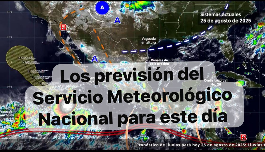 Ciudad México 25 agosto 2025.-Para hoy, el monzón mexicano e inestabilidad atmosférica, propiciarán lluvias puntuales intensas en el norte y centro de Nayarit; centro y sur de Sinaloa y oeste de Durango; puntuales muy fuertes en Sonora y Chihuahua; y puntuales fuertes en Baja California Sur y Baja California.
