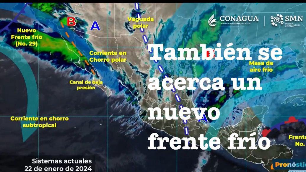Ciudad de México a 22 de Enero del 2024.-Este día, un frente frío 29 de corta duración, se aproximará al noroeste del territorio nacional, interaccionará con inestabilidad en niveles altos de la atmósfera y con las corrientes en chorro polar y subtropical, ocasionando lluvias puntuales intensas en Baja California, lluvias puntuales muy fuertes en Sonora, lluvias puntuales fuertes en Chihuahua e intervalos de chubascos en Baja California Sur, Sinaloa y Durango.
