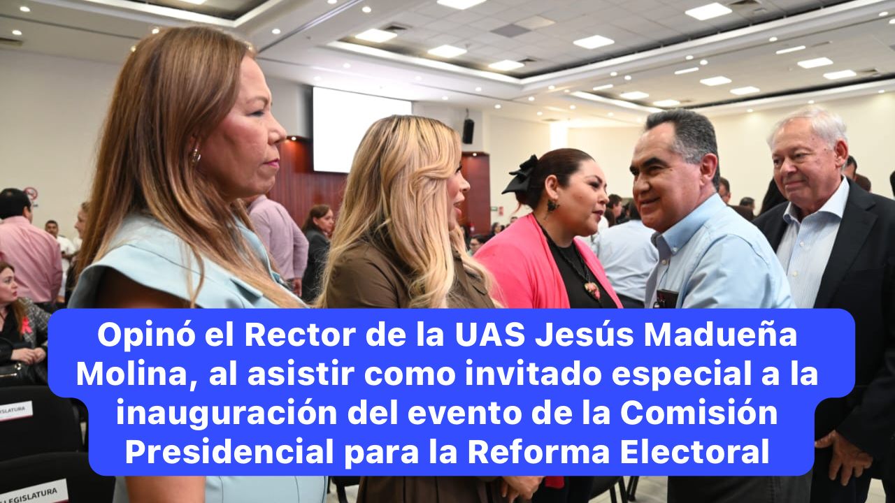 Culiacán,Sin.,22 oct.2025.-Es relevante que se tengan claras las propuestas y que tanto los universitarios como la sociedad en general participen, opinó el Rector de la Universidad Autónoma de Sinaloa (UAS), doctor Jesús Madueña Molina, al asistir como invitado especial a la inauguración del evento de la Comisión Presidencial para la Reforma Electoral, Audiencias Públicas en las Entidades Federativas, doctor Rubén Rocha Moya.