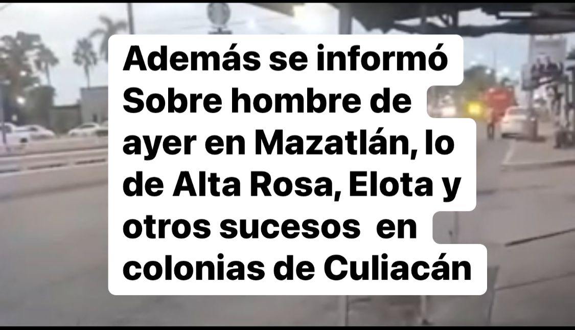 Se confirmó por parte de personal de Defensa, enfrentamiento entre civiles armados en la comunidad de Alta Rosa, municipio de Elota. Después de reportes que se realizaron sobre detonaciones de arma de fuego en dicha comunidad, se realizaron recorridos de reconocimiento por parte de persona militar, y se localizaron y aseguraron 3 camionetas, una de ellas con blindaje, así como 2 artefactos explosivos; así mismo en el lugar se encontró una persona sin vida, de sexo masculino derivado del enfrentamiento entre civiles. Se hizo cargo Fiscalía.