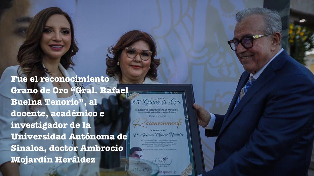 “En el marco del 134 aniversario de su natalicio me congratulo por asistir a la entrega de la presea Grano de Oro Gral. Rafael Buelna Tenorio 2024, al galardonado post mortem doctor Ambrocio Mojardín Heráldez. El doctor Mojardín fue un universitario muy destacado que pugnó por una universidad democrática, plural y moderna, tuvo además una prolífica producción científica que aún goza de su reconocimiento, y fue un respetado maestro y funcionario en la Universidad y en la administración pública estatal”, señaló el gobernador.