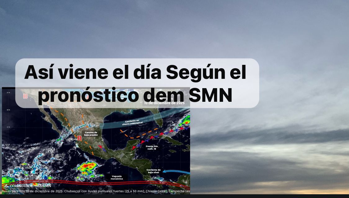 México, 10 dic.2025.-Este día, el frente número 19 se mantendrá con características de estacionario sobre el oriente de la península de Yucatán, originará lluvias puntuales fuertes en Chiapas (este), Quintana Roo, Campeche (este) y Yucatán (este); y se prevé que deje de afectar al territorio nacional al final del día.