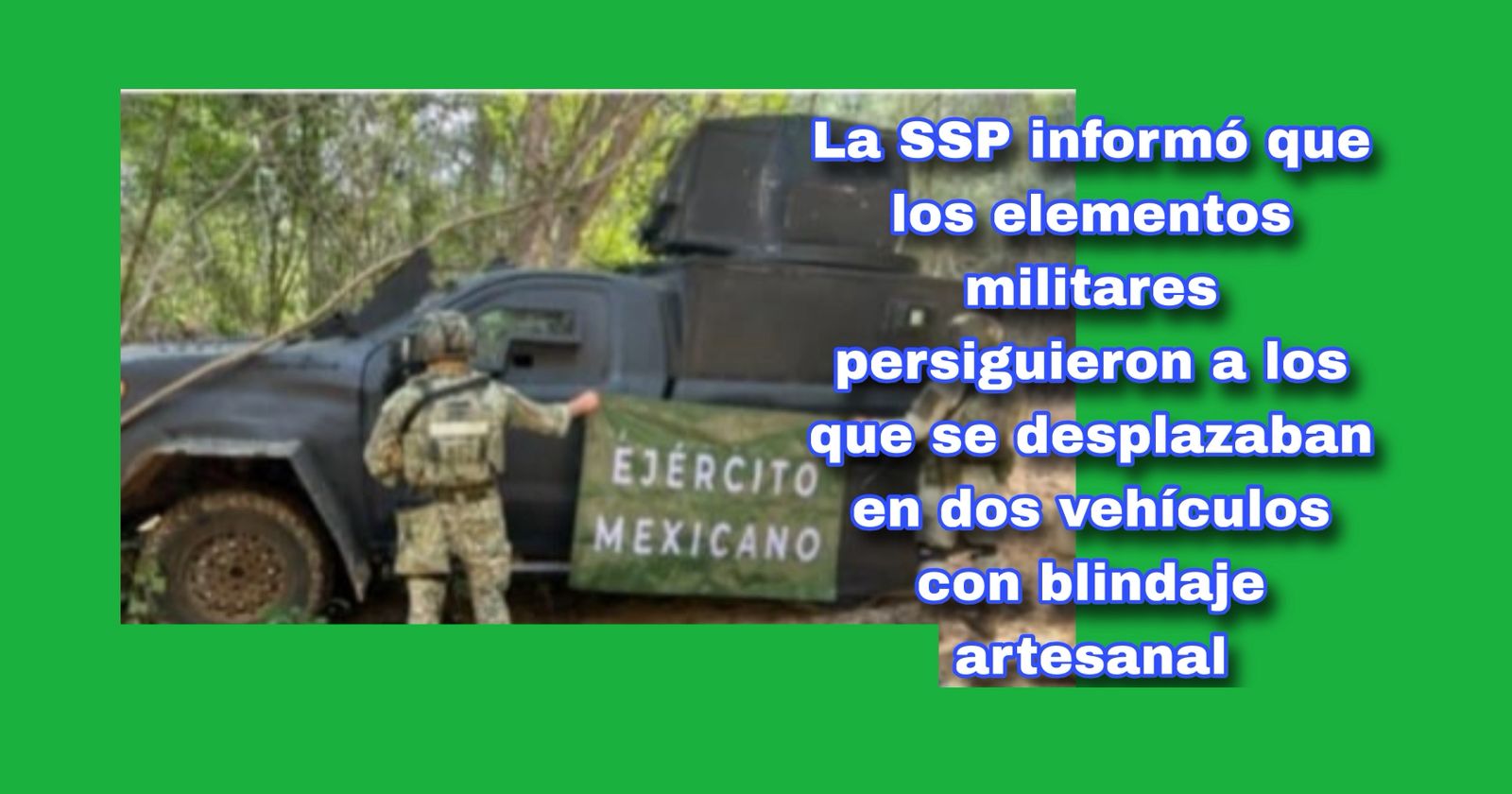 Al realizar reconocimientos terrestres en el poblado El Roble, los elementos militares fueron agredidos por civiles armados que se desplazaban en dos vehículos con blindaje artesanal, conocidos como “monstruos”. La agresión fue repelida por la autoridad, logrando asegurar en el lugar lo siguiente: