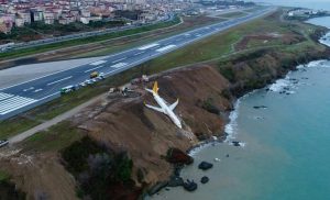 Un avión de Pegasus Airlines patinó fuera de la pista y quedó atascado en un acantilado del Mar Negro en el aeropuerto de Trabzon en Turquía, dejando una imagen aterradora.