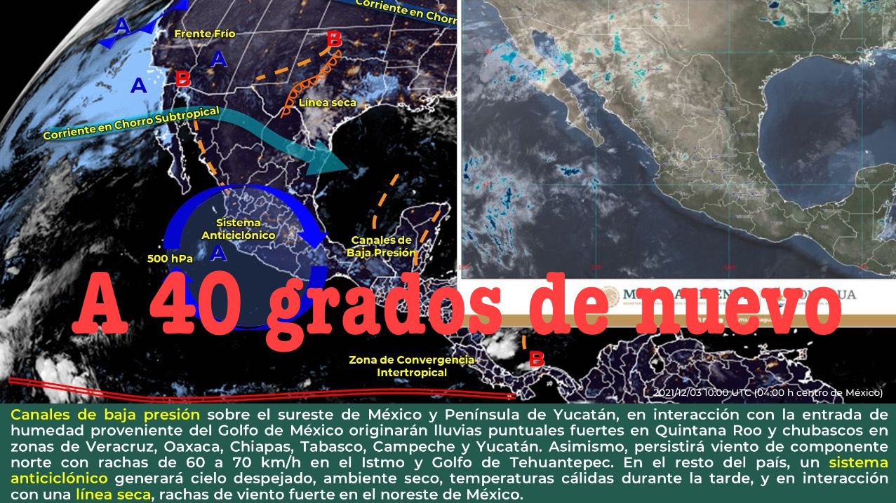 Por otra parte, un canal de baja presión y el ingreso de humedad del Océano Pacífico y Golfo de México, generarán lluvias y chubascos vespertinos con descargas eléctricas sobre entidades del sur y sureste del territorio mexicano, así como en la Península de Yucatán.