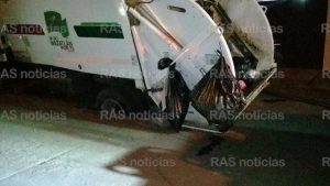 Un camion de basura que realizaba su recorrido de recolección quedo suspendido luego que La pesada unidad cayera con sus neumáticos traseros izquierdos en un hoyo.