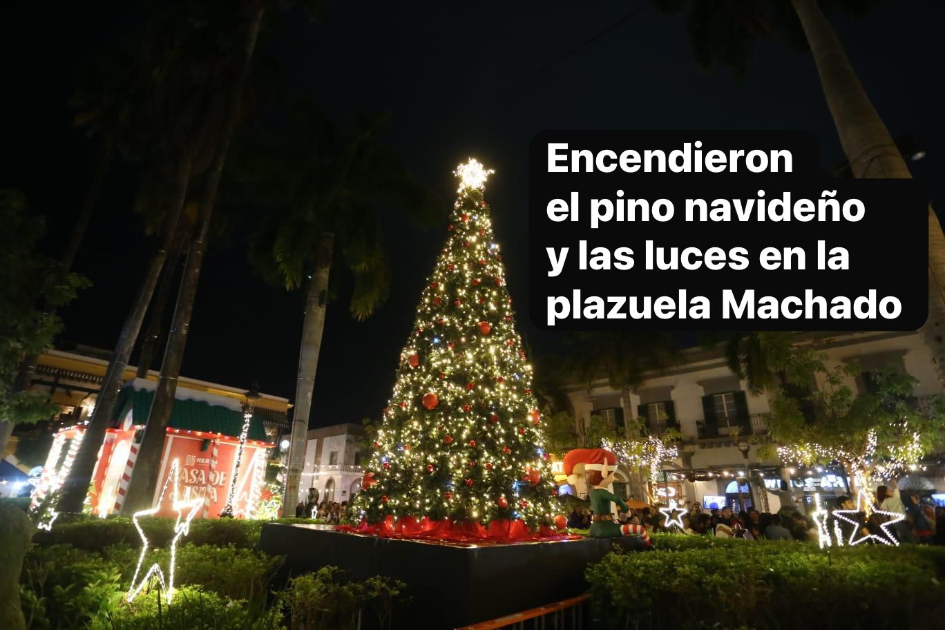 Mazatlán, Sin., 5 dic. 2025.– La noche de este viernes, el Secretario del Ayuntamiento, Moisés Ríos Pérez, en representación de la Presidenta Municipal, Estrella Palacios Domínguez, encabezó el tradicional encendido del pino navideño y la iluminación decembrina en la Plazuela Machado, corazón del Centro Histórico de Mazatlán. El acto marcó formalmente el inicio de la temporada navideña en el puerto.