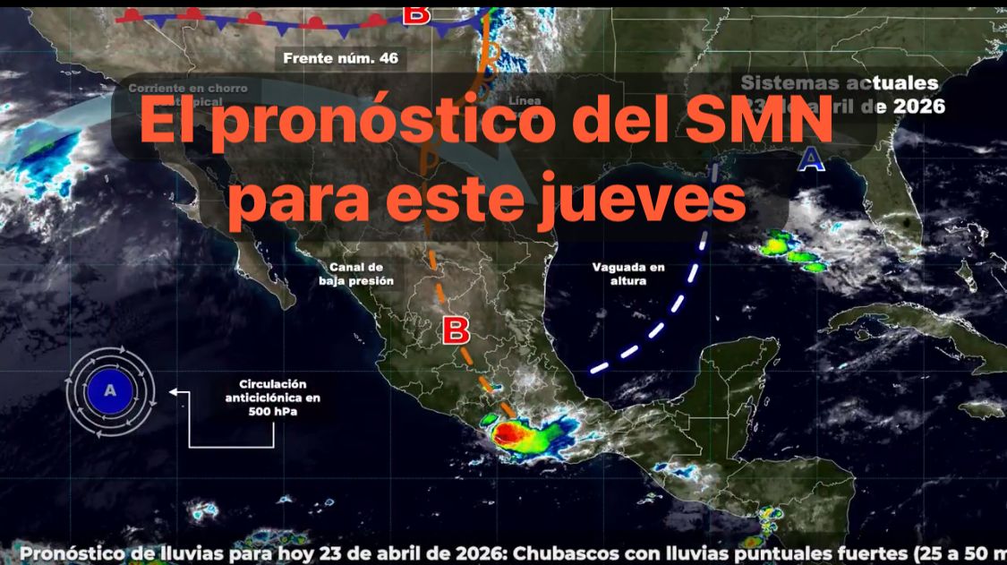 México, 23 abril 2026.-Para este día, el frente frío número 46 se extenderá sobre el noroeste de México; mientras que, una línea seca se establecerá en Coahuila, ambos sistemas interaccionarán con la corriente en chorro subtropical, generando rachas fuertes de viento en el noroeste y norte del país, así como lluvias fuertes en Coahuila y chubascos en Nuevo León y Tamaulipas, ambas precipitaciones con posible caída de granizo.