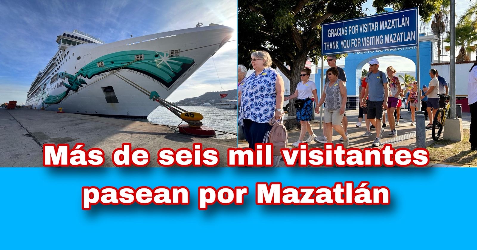 Los visitantes arribaron a tierras porteñas a bordo de dos embarcaciones: el Norwegian Jade, con 2 mil 258 pasajeros, y el Carnival Panorama, con 4 mil 169, consolidando a Mazatlán como uno de los destinos preferidos dentro de las rutas de cruceros internacionales.