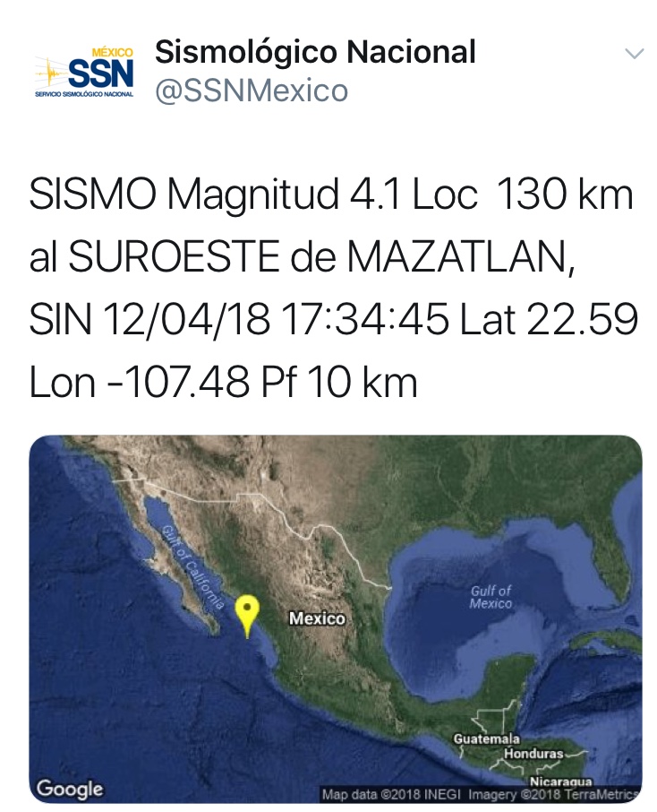 Un temblor de 4.1 grados se registró hace un momento mar adentro, frente a Mazatlán.