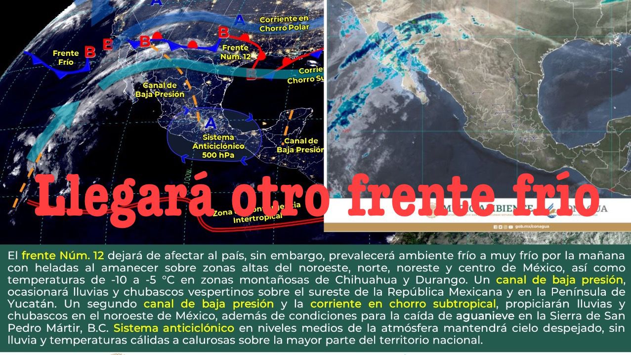 Un segundo canal de baja presión y la entrada de humedad que genera la corriente en chorro subtropical, propiciarán lluvias y chubascos en el noroeste de México, además de condiciones para la caída de aguanieve en la Sierra de San Pedro Mártir, B.C.