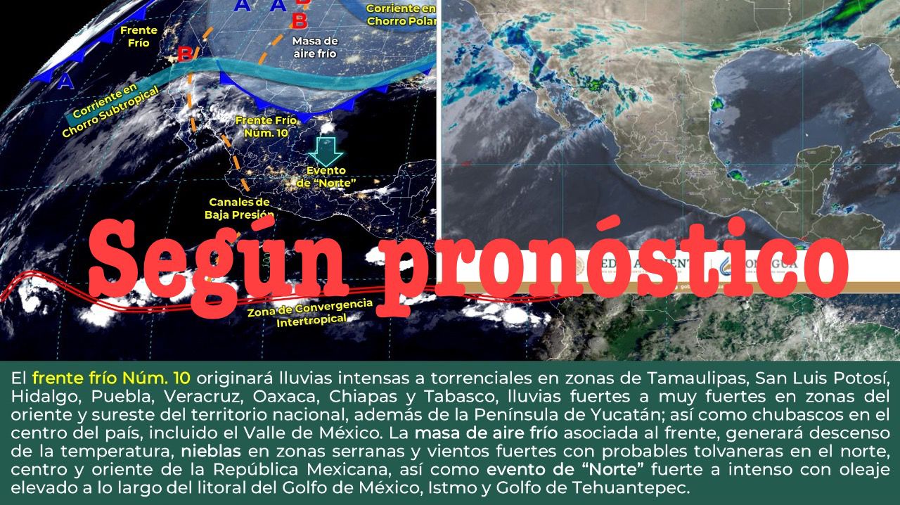 Ciudad de México, a 22 de Noviembre del 2021.-Este día, el frente frío Número 10 recorrerá el oriente y sureste de México, a su paso originará lluvias intensas a torrenciales en zonas de Tamaulipas, San Luis Potosí, Hidalgo, Puebla, Veracruz, Oaxaca, Chiapas y Tabasco, lluvias fuertes a muy fuertes en zonas del oriente y sureste del territorio nacional, además de la Península de Yucatán; así como chubascos en el centro del país, incluido el Valle de México.