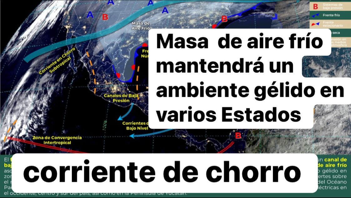 La masa de aire frío asociada al frente, generará ambiente frío a muy frío al amanecer sobre el noreste, norte y centro de México, así como gélido en zonas serranas de Chihuahua y Durango. Por otra parte, la corriente en chorro subtropical originará rachas de viento fuertes sobre el noroeste y norte de la República Mexicana.