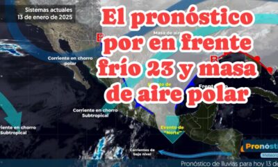 México, 13 ene. 2025.-Durante este lunes, el frente frío No. 23 se desplazará sobre el oriente y sureste de México, propiciará lluvias fuertes a muy fuertes...
