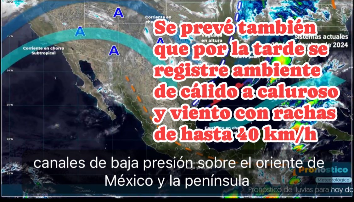 México,29 de dic. 2024.-Para este día, canales de baja presión sobre el oriente de México y la península de Yucatán, aunado al ingreso de humedad del mar Caribe, golfo de México y océano Pacífico, ocasionarán lluvias y chubascos en Puebla, Veracruz, Oaxaca, Campeche, Yucatán y Quintana Roo; pronosticándose lluvias puntuales fuertes en Chiapas.