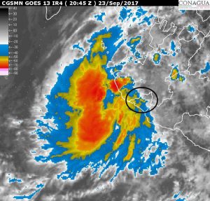 La zona de inestabilidad se mantiene estacionaria aproximadamente a 395 km al sur de la desembocadura del Rio Suchiate, frontera entre México y Guatemala con 20 por ciento de probabilidad de desarrollo ciclónico en el pronóstico a 48 horas, vientos máximos sostenidos de 20 km/h y rachas de 30 km/h.