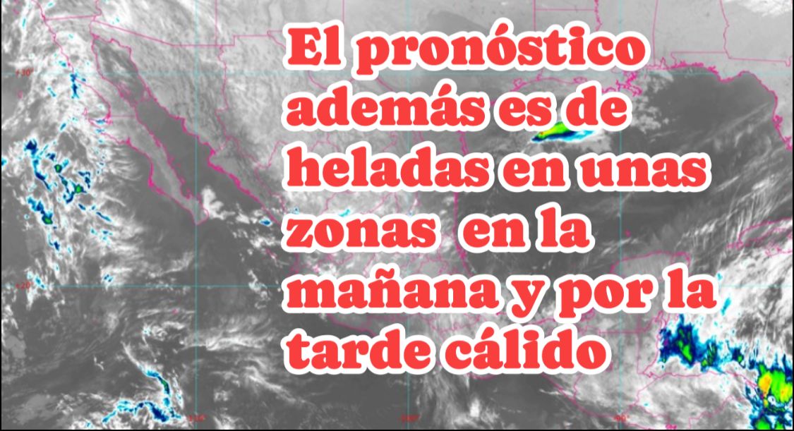 Pacífico Norte: Cielo despejado a medio nublado en el transcurso del día; sin lluvia en Sonora y Sinaloa. Por la mañana, posibles bancos de niebla en zonas costeras de Sinaloa; ambiente fresco, siendo frío a muy frío con heladas en sierras de la región, y gélido con heladas en zonas serranas del norte de Sonora. Durante la tarde, ambiente cálido en la región (con temperaturas de 30 a 35 °C en zonas de Sonora y Sinaloa), y templado en costas. Viento del oeste de 5 a 15 km/h con rachas de 25 a 35 km/h.