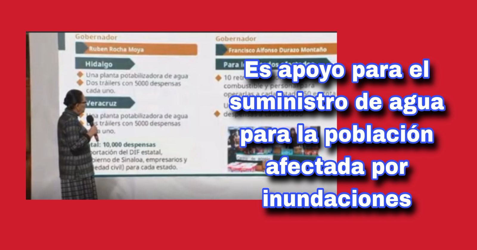 Culiacán, Sin.,17 oct. 2025.- Durante la Mañanera del Pueblo ofrecida este viernes por la presidenta de la República, Claudia Sheinbaum desde Palacio Nacional, la secretaria de Gobernación, Rosa Icela Rodríguez, informó que el Gobierno del Estado de Sinaloa, que encabeza el doctor Rubén Rocha Moya, envió un importante apoyo a los estados de Hidalgo y Veracruz para ayudar a los damnificados por las recientes lluvias que provocaron grandes inundaciones en esa zona del país.