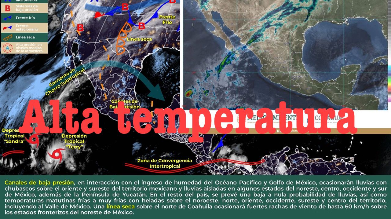 Pacífico Norte: Cielo medio nublado durante el día, sin lluvias. Ambiente fresco por la mañana. Temperaturas matutinas frías en zonas serranas de Sonora. Ambiente caluroso por la tarde. Viento del suroeste de 20 a 35 km/h.