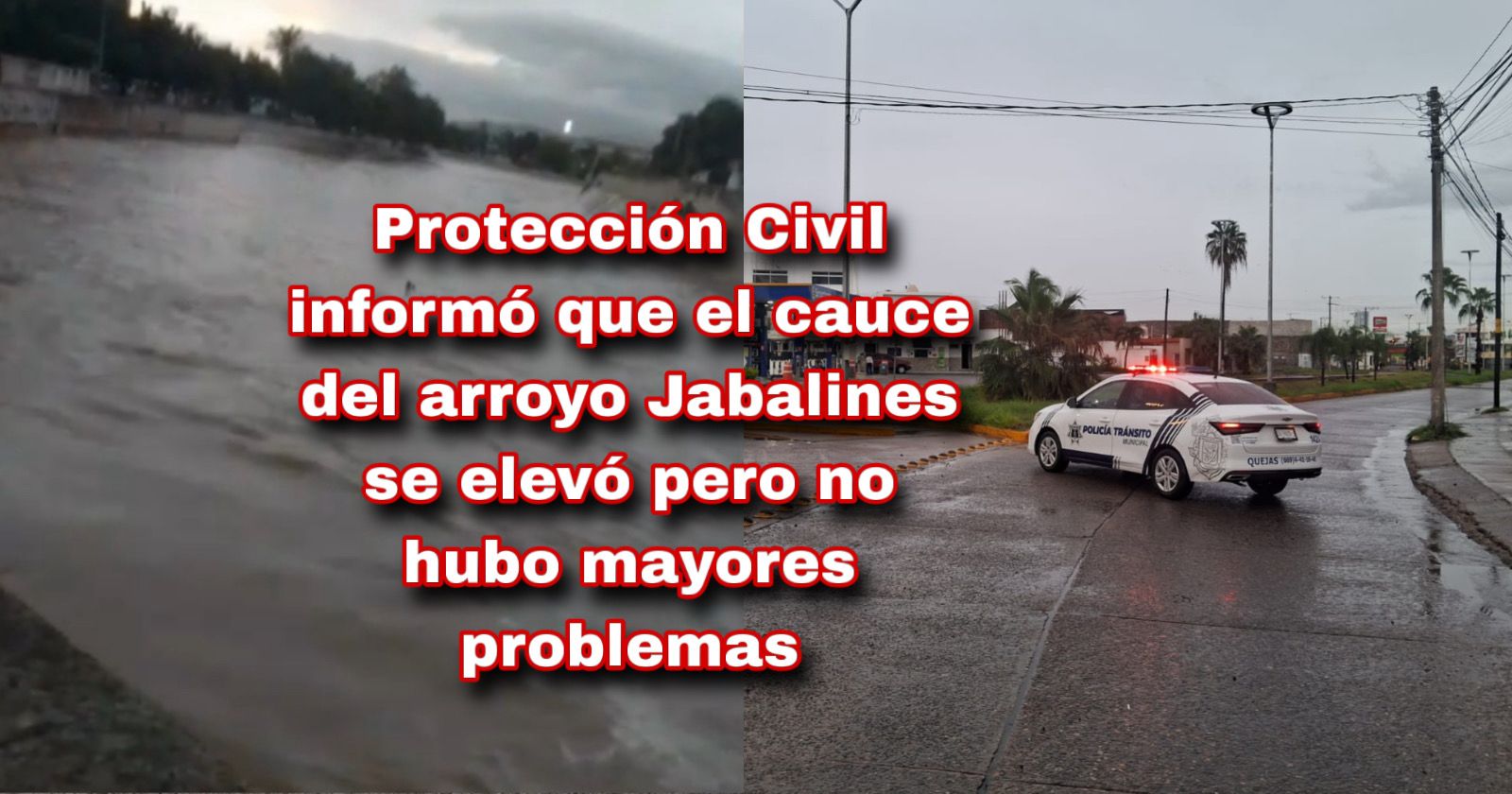 Óscar Roberto Osuna Tirado señaló que el cauce del arroyo Jabalines se elevó en un 95 por ciento de su capacidad sin generar afectaciones; asimismo, dijo que en otros puntos de la ciudad como Real Pacífico, Colonia Madero, Azteca y Alarcón los canales que cruzan se desbordaron, pero tampoco causaron daños al patrimonio de las familias.