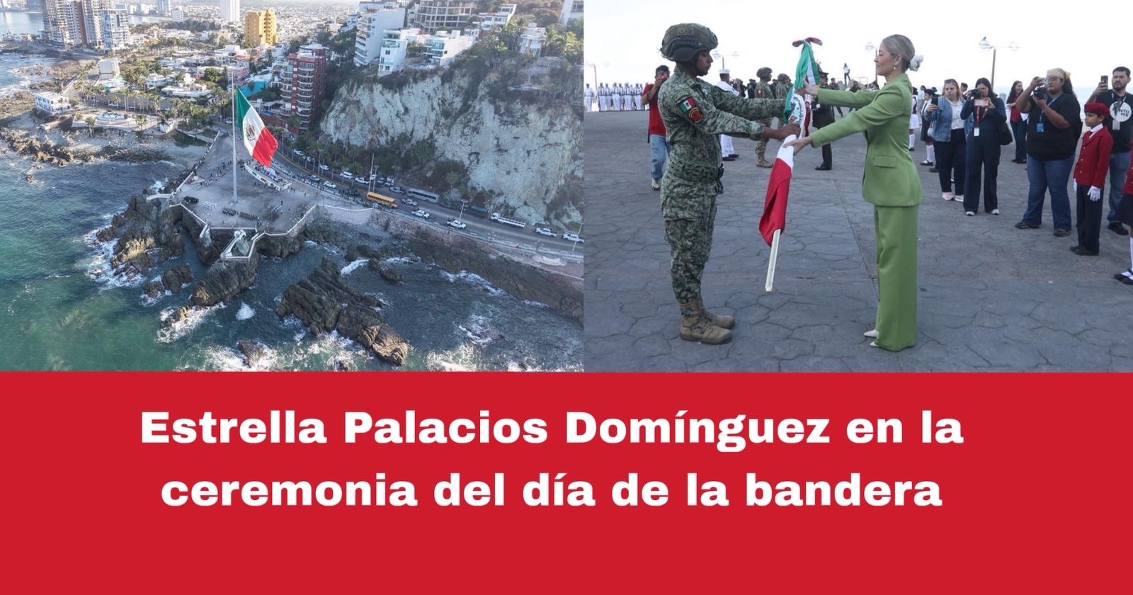 Mazatlán, Sin., 24 feb. 2026.– En el marco de la conmemoración del Día de la Bandera, la Presidenta Municipal, Estrella Palacios Domínguez, destacó que México vive una transformación histórica, un legado que se quiere dejar a futuras generaciones en justicia social, valores humanistas, laicos y republicanos, así como una visión progresista y de profundo orgullo por la historia y la soberanía nacional.