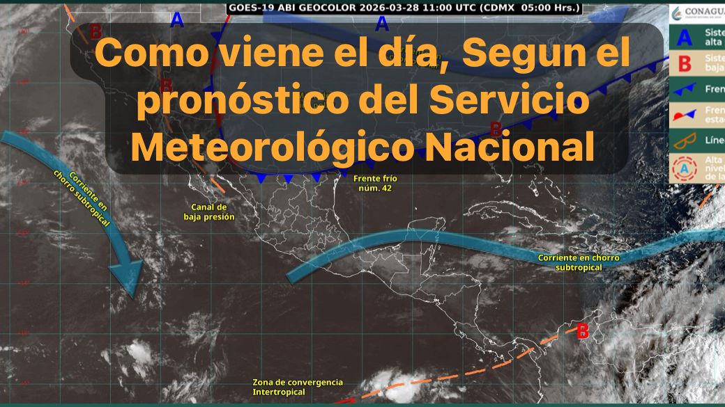 México,28 marzo 2026.-Este día, el frente número 42 se desplazará gradualmente sobre el noreste del territorio nacional, originando lluvias y chubascos en dicha región. Durante la noche, el frente se desplazará hacia el golfo de México, dejando de afectar al país.