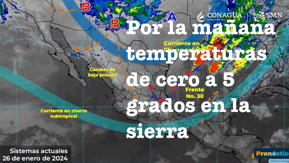 Ciudad de México a 26 de Enero del 2024.-Este día, el frente 30 se extenderá con características de estacionario sobre el noroeste y occidente del Golfo de México, en interacción con la corriente en chorro subtropical, ocasionará lluvias y chubascos en el noreste y oriente de la República Mexicana, así como fuertes rachas de viento con posibles tolvaneras en la Mesa del Norte y la Mesa Central.