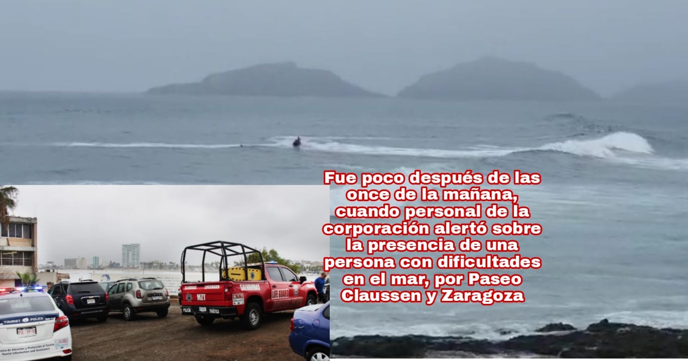 Mazatlán, Sinaloa, junio 03 del 2022.- Elementos del Escuadrón de Salvamento Acuático de la Policía Municipal lograron rescatar y poner a salvo, a un surfista que esta mañana era arrastrado por las corrientes marinas en una zona de peligro, por lo que no pudo salir por sí mismo.