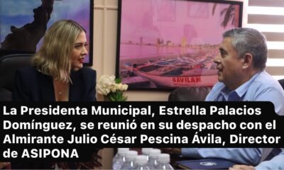 Mazatlán, Sin., 9 abril 2026.– La Presidenta Municipal, Estrella Palacios Domínguez, se reunió en su despacho con el Almirante Julio César Pescina Ávila, Director General de...