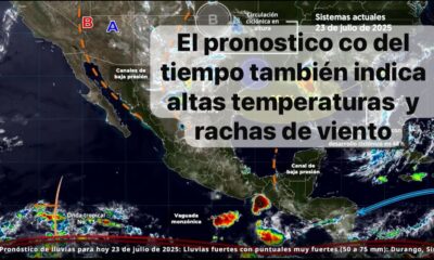 México 23, julio 2025.-Este día, el monzón mexicano sobre el noroeste del territorio nacional, en interacción con inestabilidad atmosférica, propiciarán lluvias fuertes a muy fuertes en...