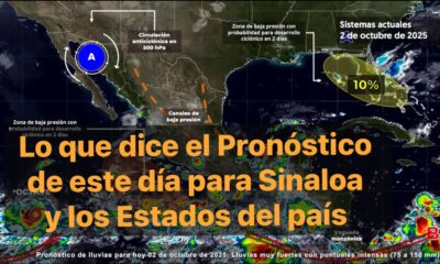 México,2 oct. 2025.-Para hoy, una zona de baja presión con probabilidad para desarrollo ciclónico al sur de Guerrero y la vaguada monzónica que se extenderá frente...