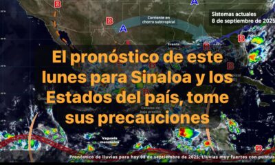 México, 8 sept. 2025.-Para hoy, el monzón mexicano originará lluvias puntuales intensas en Nayarit; puntuales muy fuertes en Sinaloa y Durango; lluvias con intervalos de chubascos...
