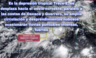 México. 11 sept. 2025.-Esta tarde se ha formado la depresión tropical Trece-E, se desplaza hacia el oeste-noroeste, paralelo a las costas de Oaxaca y Guerrero. Su...