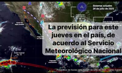 México,24 julio 2025.-Para hoy, el monzón mexicano persistirá sobre el noroeste del territorio nacional y en interacción con una vaguada en altura producirán lluvias puntuales fuertes...