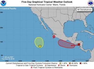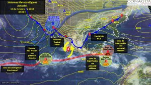 El reporte de las 12:00 horas del centro de huracanes de Miami, Florida indica que uno de los disturbios tendrá un noventa por ciento posibilidad de formación ciclónica en un lapso de cinco días días; el segundo tendría el 20 por ciento en ese mismo tiempo y el otro entre 40 y 60 por ciento de evolución.