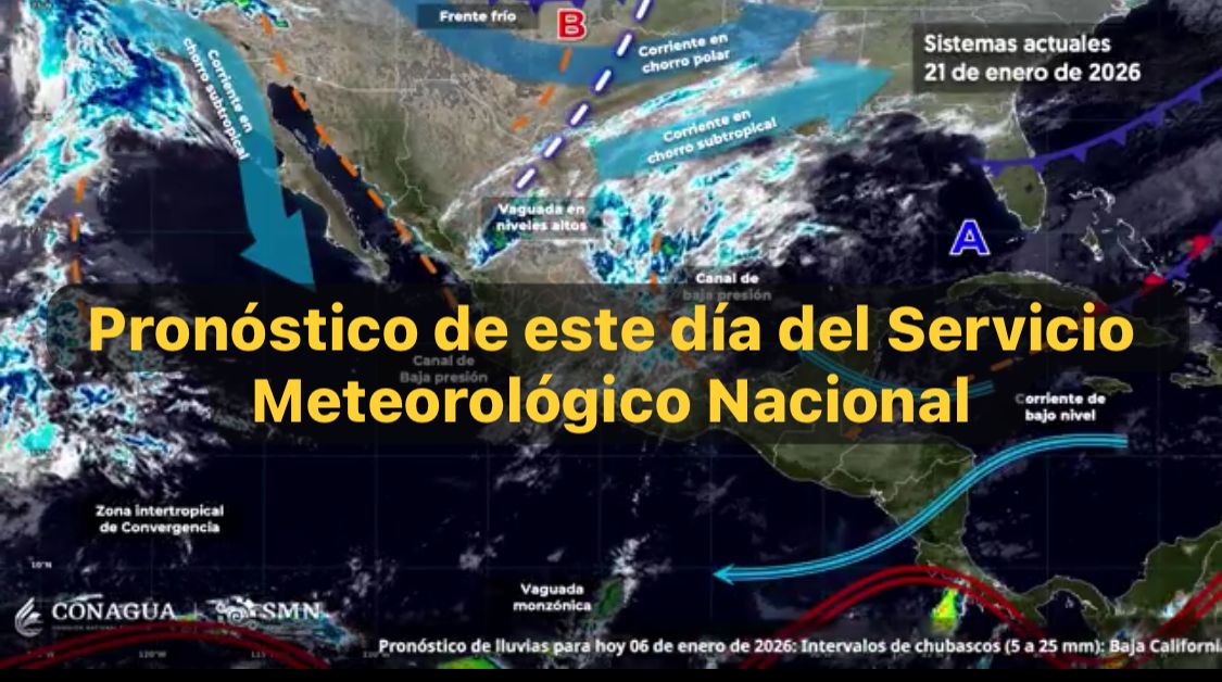 México, 21 ene. 2026..-Este día, una vaguada en niveles altos de la atmósfera cruzará el noreste y centro del país, en interacción con la corriente en chorro subtropical e inestabilidad atmosférica, originarán lluvias y chubascos con descargas eléctricas en estados del norte, noreste, occidente y sur del territorio mexicano; con posible caída de granizo en estados del centro y oriente de la República Mexicana, incluido el valle de México.