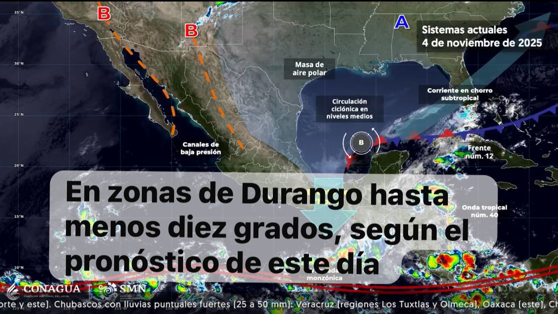 México,4 nov. 2025.-Para hoy, el frente número 12 se extenderá con características de estacionario sobre la península de Yucatán y la Sonda de Campeche, interaccionará con la nueva onda tropical (número 40) que se aproximará a Quintana Roo y con una circulación ciclónica en niveles medios de la atmósfera sobre el golfo de México, ocasionando lluvias fuertes a muy fuertes con descargas eléctricas en Veracruz (regiones Los Tuxtlas y Olmeca), Oaxaca (este), Chiapas (norte), Tabasco (oeste y centro), Campeche (suroeste), Yucatán (norte y este) y Quintana Roo (norte y costa).