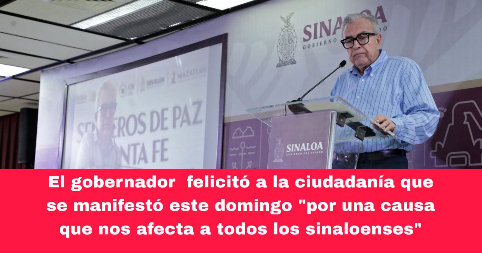 Durante su Conferencia Semanera de este lunes, dijo “Simple y llanamente quiero felicitar a la ciudadanía que fue a manifestarse justamente por una causa que nos afecta a todos los sinaloenses, todos queremos la paz; mi reconocimiento a los hombres y mujeres, a las ciudadanas y ciudadanos que estuvieron participando en la marcha de ayer, eso expresa el ambiente de libertades que tiene nuestro estado y que se pueden manifestar con todo el vigor y con toda la determinación de los ciudadanos”, dijo.