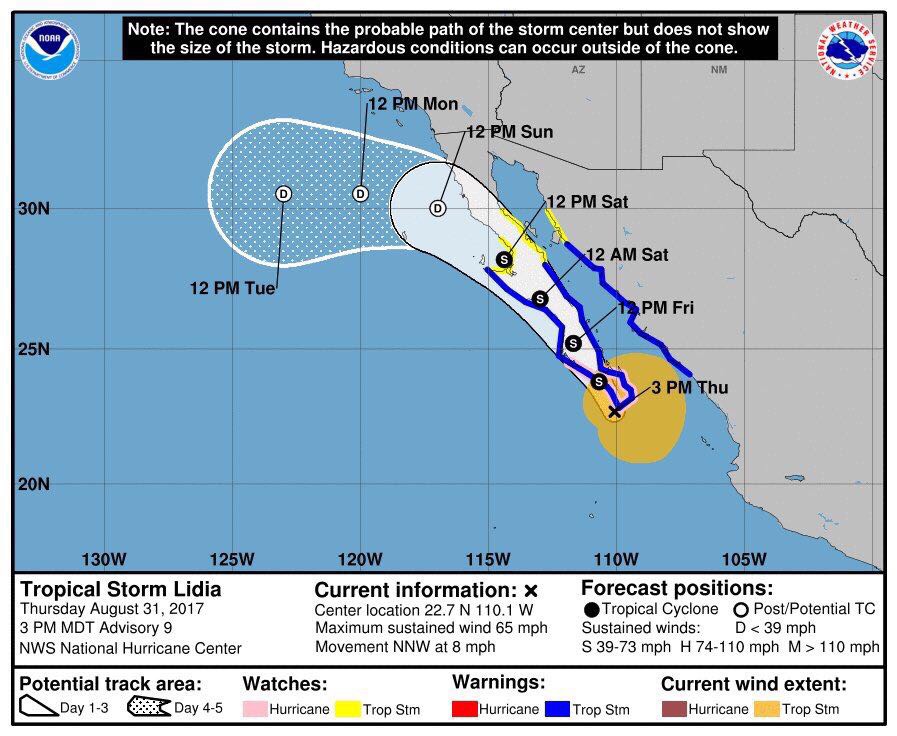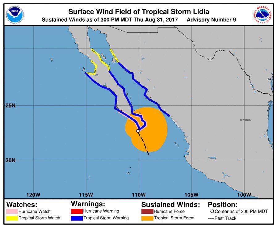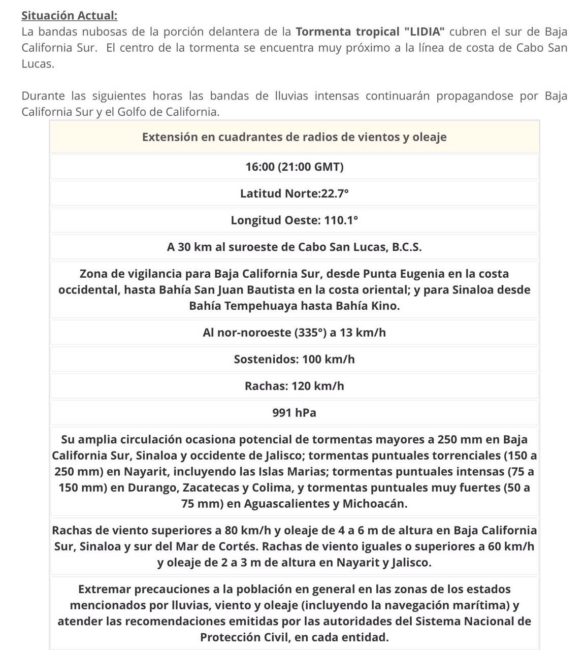La Tormenta tropical “LIDIA” se fortalece, su centro se encuentra muy cerca de la costa de Baja California Sur: El sistema, ocasiona lluvias, vientos fuertes y oleaje elevado en Baja California Sur, Sinaloa, Nayarit, Jalisco, Colima y Michoacán.