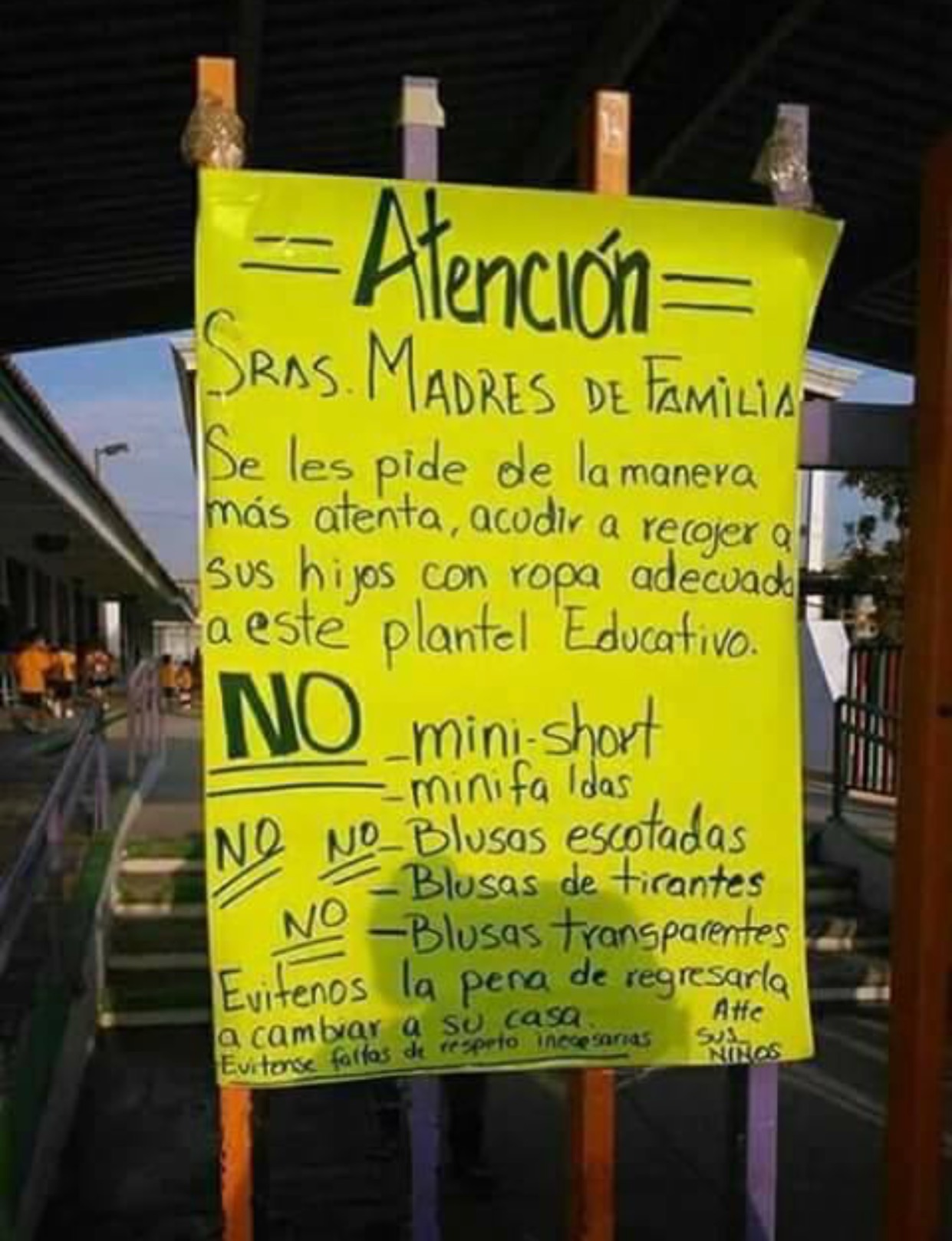 El cartel dice lo siguiente: “Atención, Sras. Madres de Familia, Se les pide de manera más atenta, acudir a recoger a sus hijos con ropa adecuada a este plantel educativo” “No mini short, No minifaldas, No blusas escotadas, No blusas de tirantes, No blusas transparentes,” “Evitemos la pena de regresarla a cambiarla a su casa, Evítense faltas de respeto innecesarias, Atentamente sus niños”