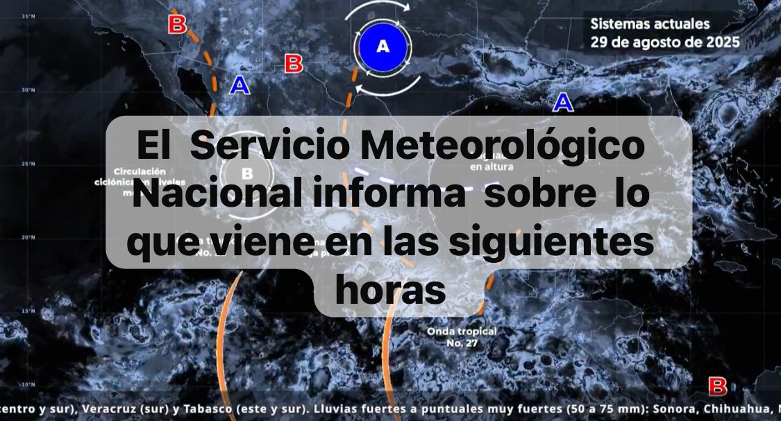 México, 29 agosto 2025.-Para hoy, el monzón mexicano, el aire húmedo generado por la corriente en chorro subtropical, y una circulación ciclónica en niveles medios de la atmósfera, mantendrán lluvias puntuales fuertes a muy fuertes en noroeste de México; chubascos en Baja California Sur; y lluvias aisladas en zonas de Baja California.