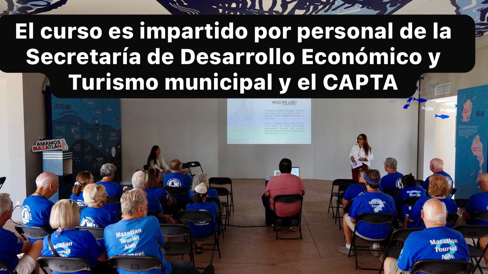Mazatlán, Sin., 18 abril 2026.– Con el objetivo de fortalecer la atención al visitante, personas voluntarias de la agrupación Blue Shirt participaron en la capacitación “Aliados del Turista”, impartida por personal de la Secretaría de Desarrollo Económico y Turismo (SEDECTUR) y el Centro de Atención y Protección al Turista ( CAPTA) del Gobierno Municipal, encabezado por la Presidenta Estrella Palacios Domínguez.