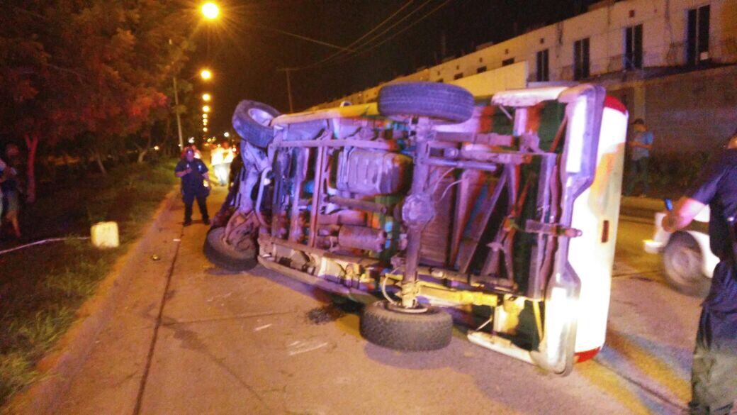 una camioneta volcada, un camion rojo dañado y cinco de sus viajeros lesionados dejo un accidente ocurrido la noche de este domingo.