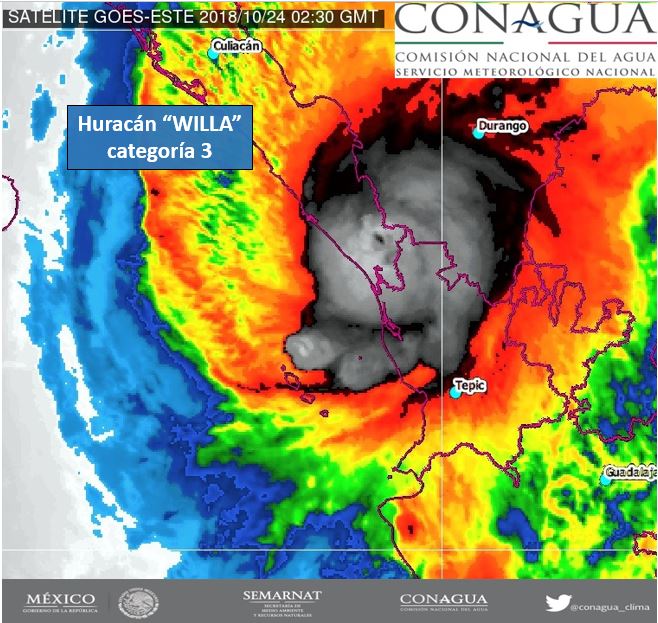 El centro del Huracán *“WILLA”* de categoría 3, se localiza sobre tierra en el sur de Durango, a 90 km al este de Mazatlán.