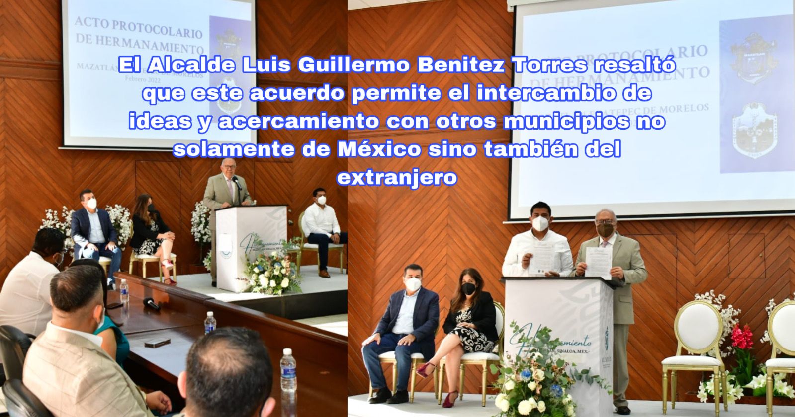 Durante el acto protocolario en la Sala de Cabildo, el Alcalde Luis Guillermo Benitez Torres resaltó que este acuerdo permite el intercambio de ideas y acercamiento con otros municipios no solamente de México sino también del extranjero, para atraer inversiones, relaciones e intercambio cultural.
